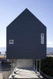 敷地は諏訪湖近くの川辺に位置する。かつては水辺と対岸に連なる穏やかな自然により、風光明媚な場所であったことが想像できるところだが、河川の氾濫を抑制するために盛上げられた土手によって、水平に拡がるその景色が塞き止められてしまっているように思えた。 一方、街路と土手に挟まれた土地の突端に位置するという極めて稀な状況でもあったことから、先端の持つ特異性、川辺と街並みを繋ぐようなその土地の特性を保持したいと考えた。 建築主の要望は、「寒冷地においても暖かく住める小さな家」「屋根付駐車場」「眺望の確保」といったシンプルなものであった。 軟弱地盤で、かつ多湿であることが想定される場所であったことから、漠然と高床式が相応しいと感じていた。地盤面から土手の高さを超えて持ち上げられた居住域は、眺望と開放性を取り戻すとともに、風が通り抜け、視界が拡がる大きな軒下空間を生むことになる。 これがこの土地の固有性を保持することに繋がるように思えた。鋼管杭を高止まりさせ、その上に鉄骨と木造の複合フレームでつくられた単純なヴォリュームを乗せるという構成には、地盤面と建物を切り離し、土と構造物の接点を極力少なくする事による地盤面の環境保護、場の状況の継続というねらいも込められている。 持ち上げられた家型の内と外に漂う空気、川の流れのような気配を感じながら、この土地にしか無い豊かな暮らしが育まれる事を期待している。