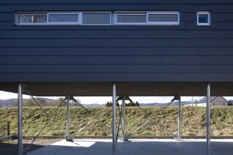 軟弱地盤で、かつ多湿であることが想定される場所であったことから、漠然と高床式が相応しいと感じていた。地盤面から土手の高さを超えて持ち上げられた居住域は、眺望と開放性を取り戻すとともに、風が通り抜け、視界が拡がる大きな軒下空間を生むことになる。