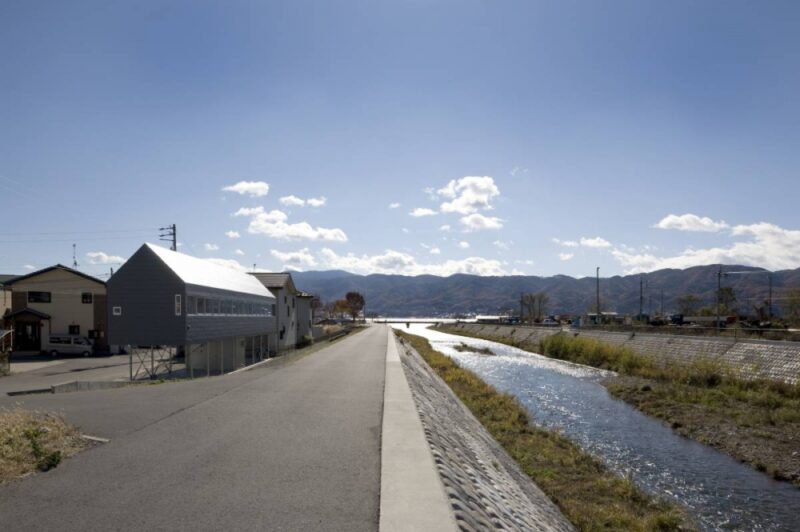 敷地は諏訪湖近くの川辺に位置する。かつては水辺と対岸に連なる穏やかな自然により、風光明媚な場所であったことが想像できるところだが、河川の氾濫を抑制するために盛上げられた土手によって、水平に拡がるその景色が塞き止められてしまっているように思えた。